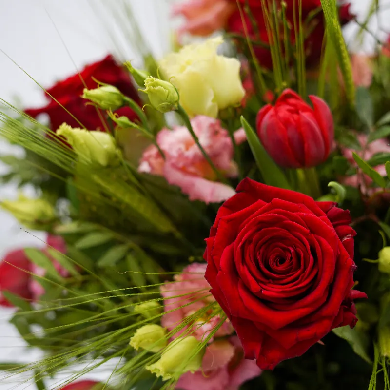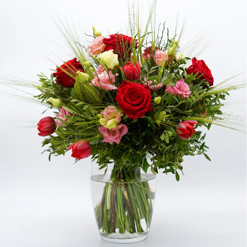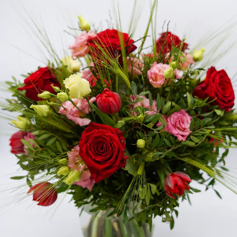 Romantičen šopek, ki združuje strast rdečih vrtnic z nežnimi roza lizianthusi, dopolnjenimi z zelenjem pistacije.
